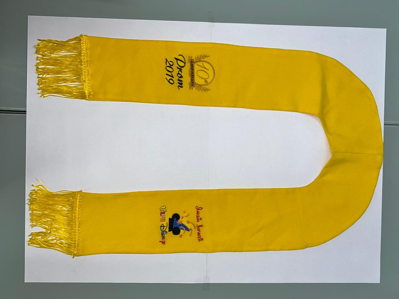 Estola amarilla tipo bufanda con flecos bordados y diseño infantil. Un clásico para ceremonias de grado con toque llamativo.
